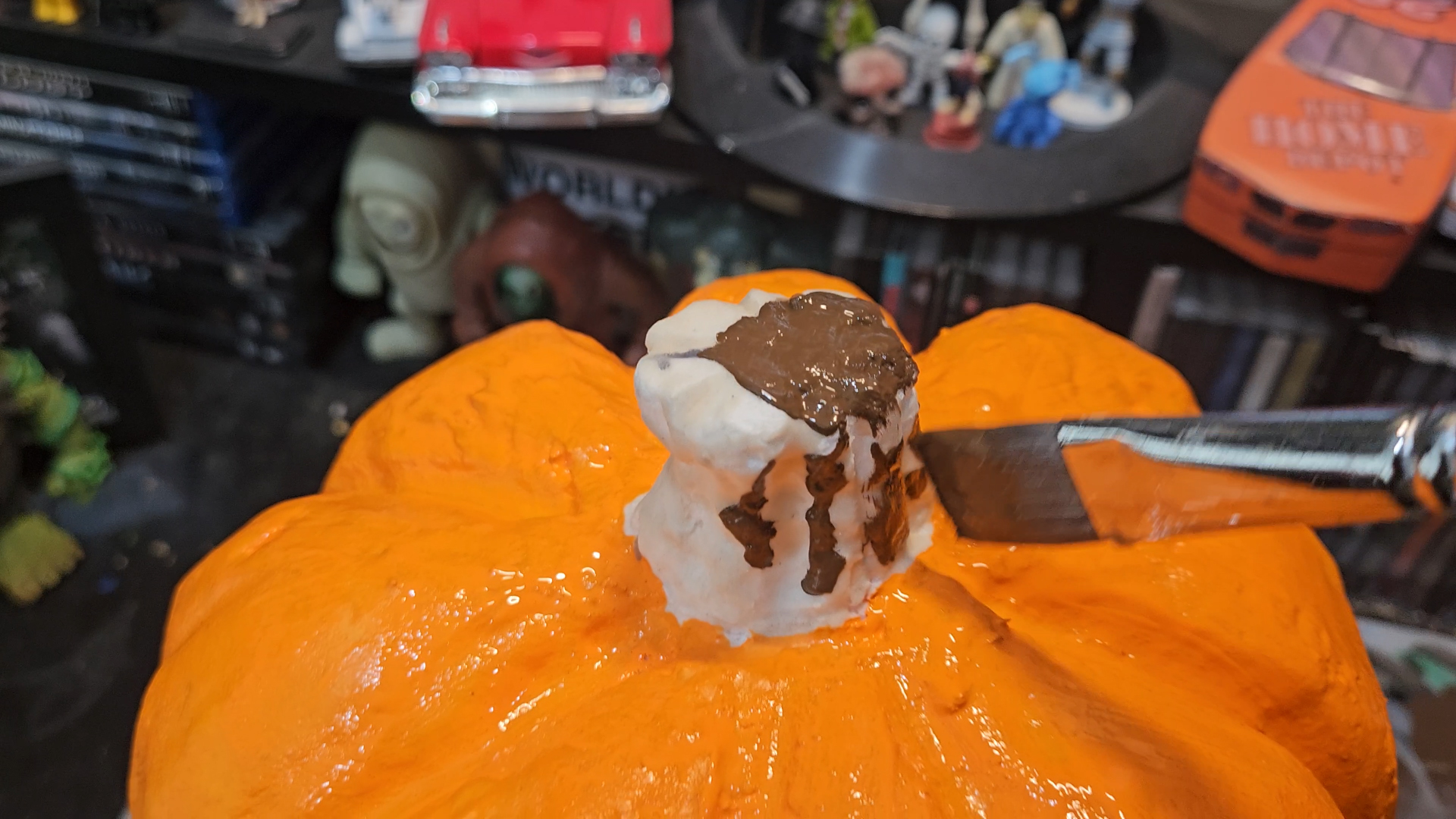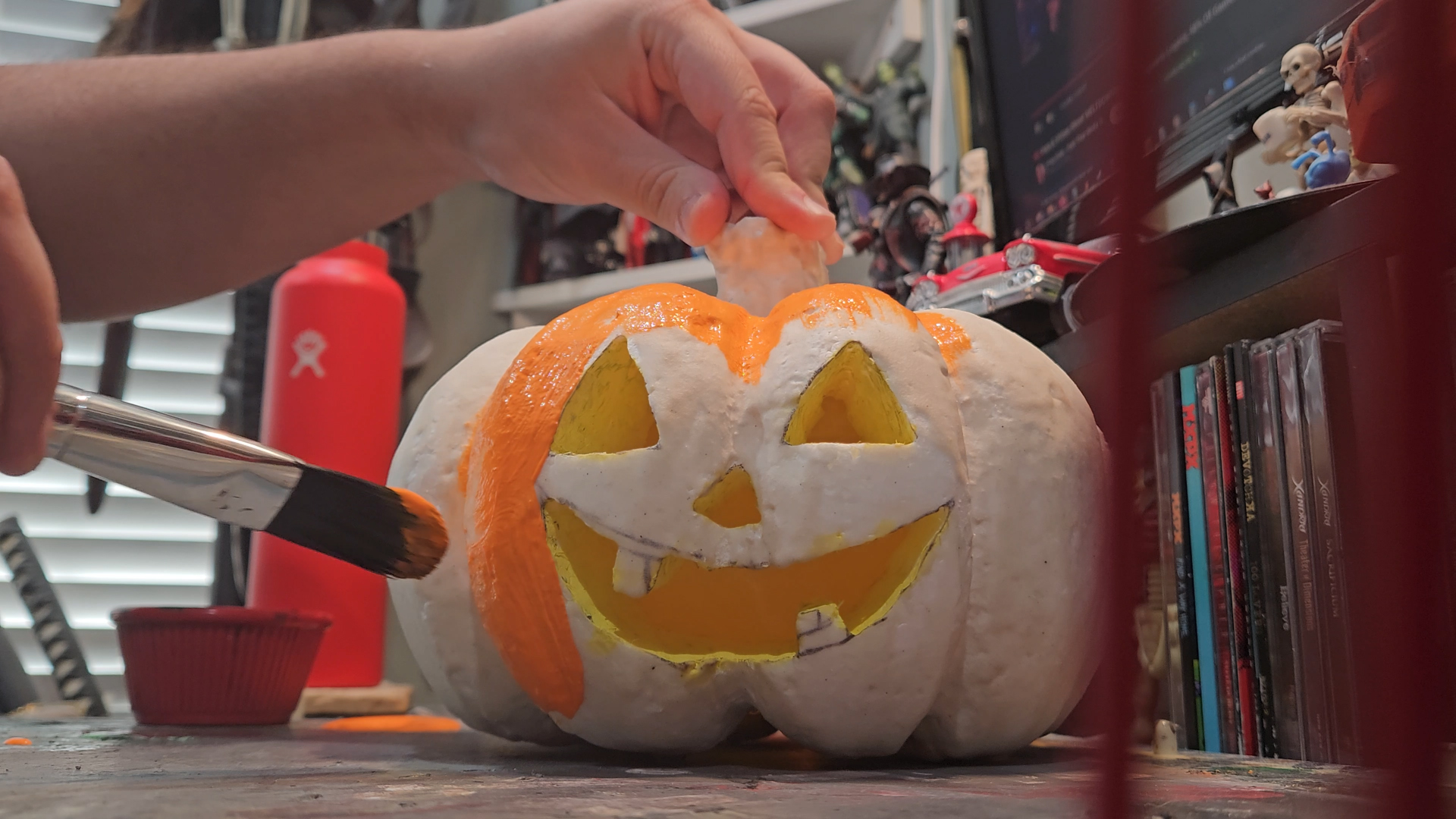Paint the Jack O’Lantern orange and the stem brown.