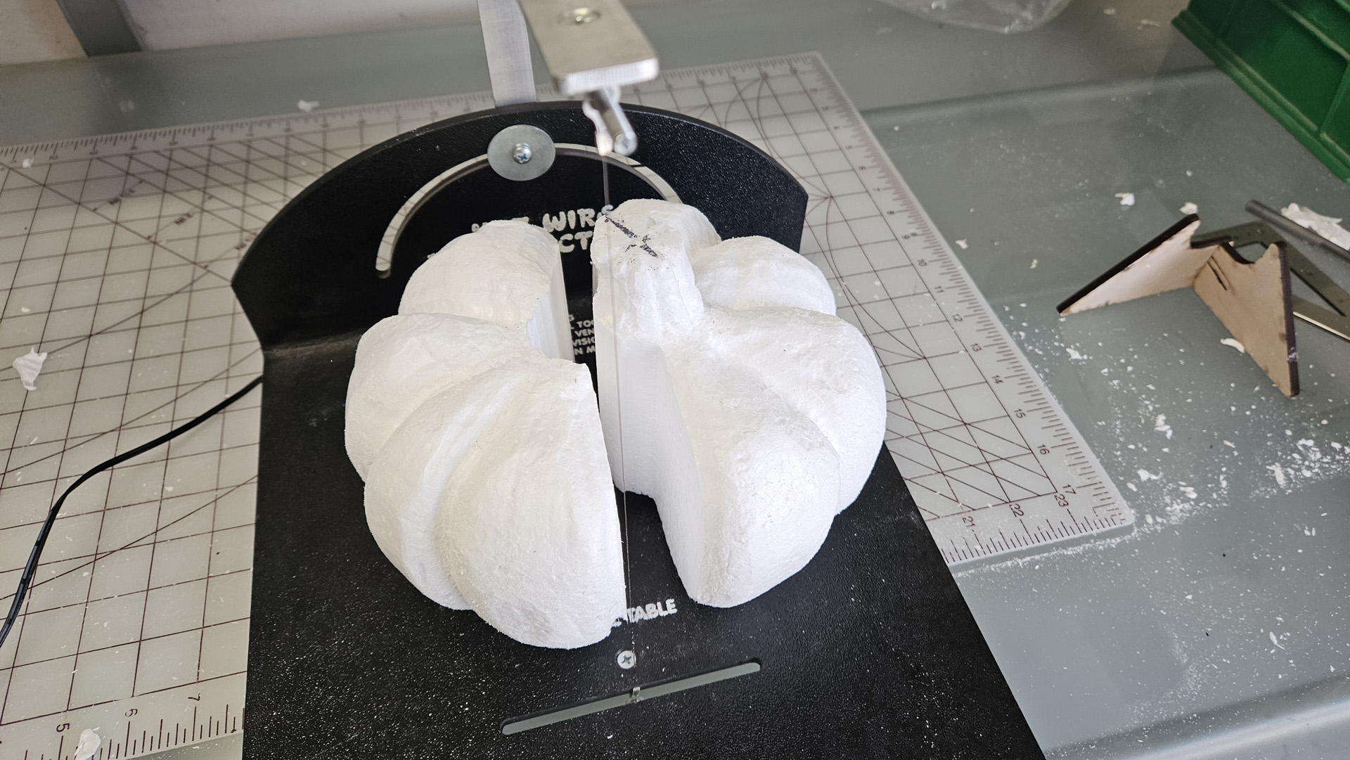 Mount your 3D Scroll table with a shapeable routing wire and bend the wire to your desired profile for the Jack O’Lantern. Then, pin your foam cube down with the secondary overhead arm, plug your Scroll Table into your power supply, turn the power supply on, push your foam into the shapeable wire and rotate it until the full shape is cut out.