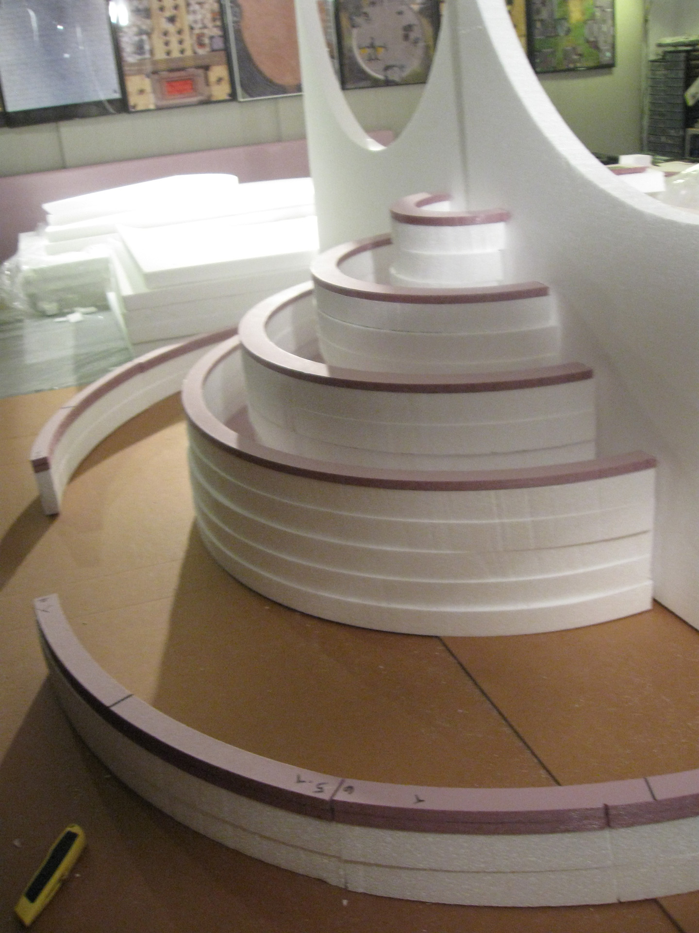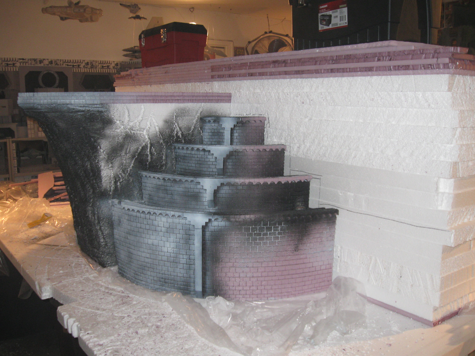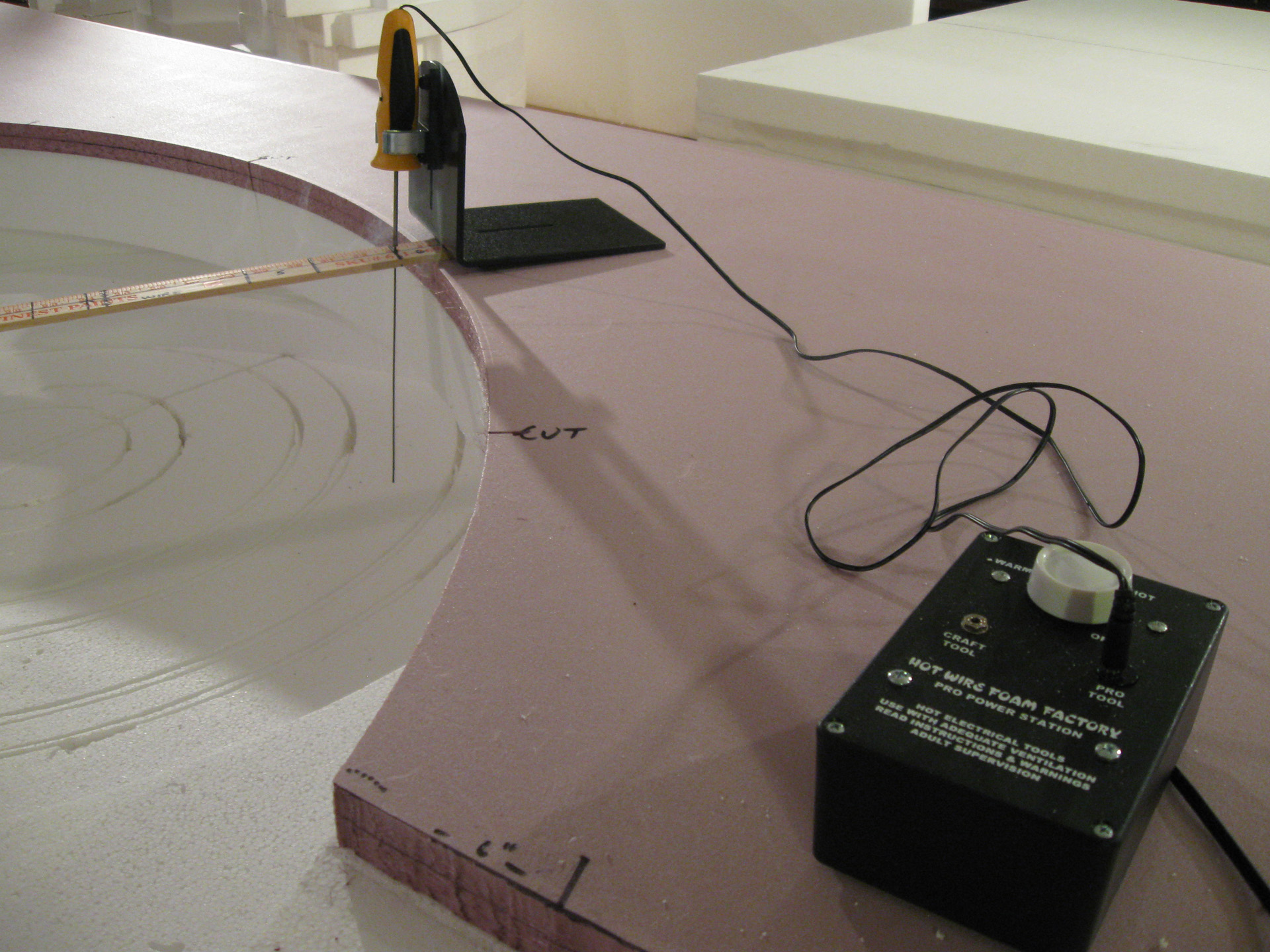 Here are some pics of my construction of my 28mm scale Minas Tirith. I made a compass using a yard stick, drilled 16 gauge holes in the yard stick for the hot wire blade to go into, and used the 8 Inch Pro Hot Knife to cut the circles out. Using a 10 inch nail in the center of the board to hold the yard stick in place, I made perfect circles using the yard stick and the Sled Guide – that was the most important part of the whole project. (I actually cut on top of 5 sheets or 10 inches of styrofoam, so I wouldn’t hit the plywood table underneath it all). I cut into 4 sheets of styrene while I was making circles, so that the circles would all be the same.